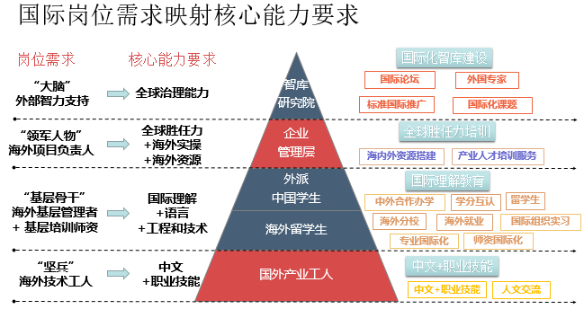 根據國際崗位需求映射核心能力需求,以國際化智庫建設為智力支持,為海外項目領軍人物提供全球勝任力培訓;為留學生提供海外實習就業、師資國際化等國際理解教育;為海外產業工人提供“中文+職業技能”培訓。